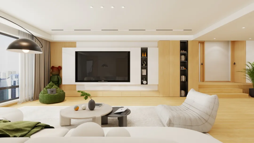 静雅的漆白色电视柜与自然的麦芽黄色收纳柜,做一体式设计,在骊住地板的天然木纹搭配下协调、实用,让空间富有的层次感。