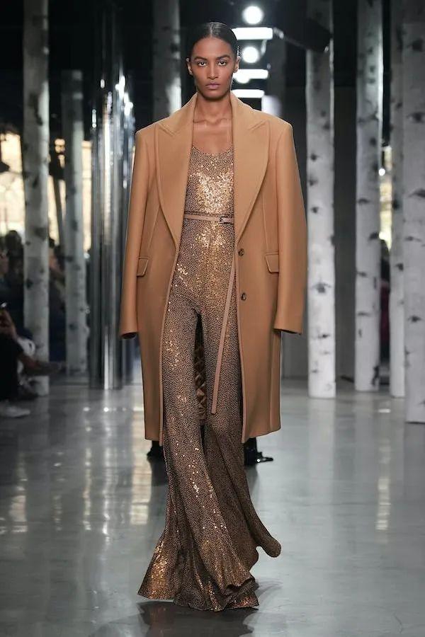 Michael Kors 2023秋冬系列以城市波西米亚风情为主题,塑造优雅与沉稳兼具的都市摩登女郎。在本季中既可以看到利落干练的西服外套和垫肩大衣,也可以看到灵动吸睛的流苏裙装与亮片连体裤。性感迷人的连体衣则被赋予全新的晚装质感。饰以轻松慵懒的腰带完成点睛之笔,释放出女性的坚定与随性。